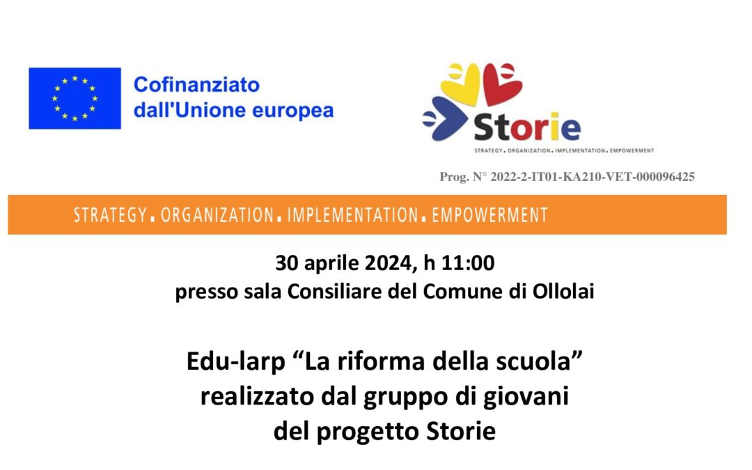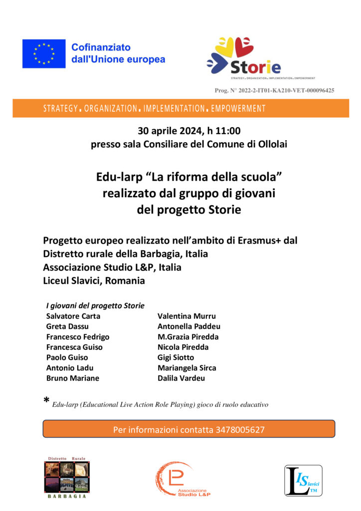 Edu-larp “La riforma della scuola” Progetto Europeo Erasmus+ Storie. Per informazioni contatta lo Studio L&P al numero 3478005627
